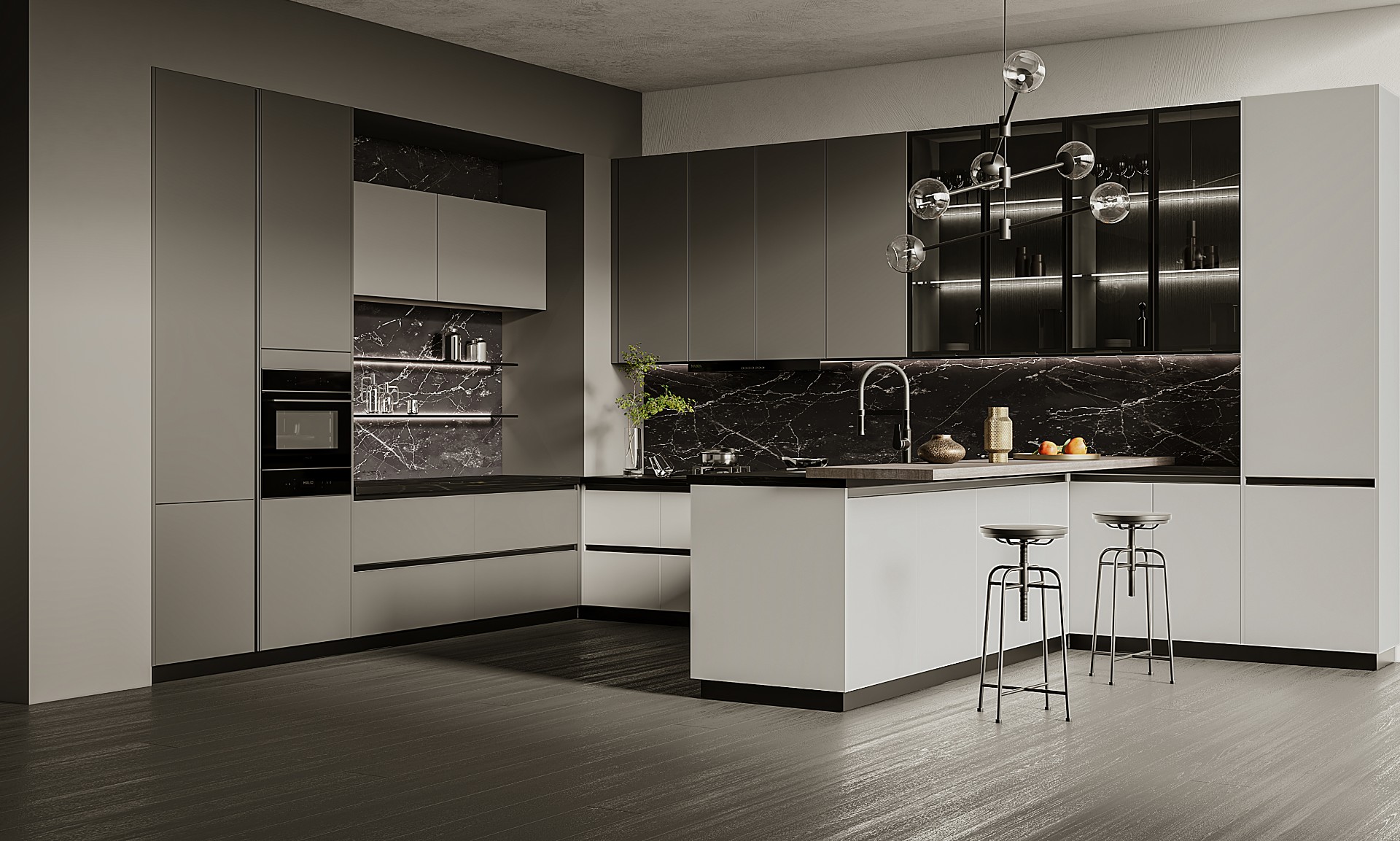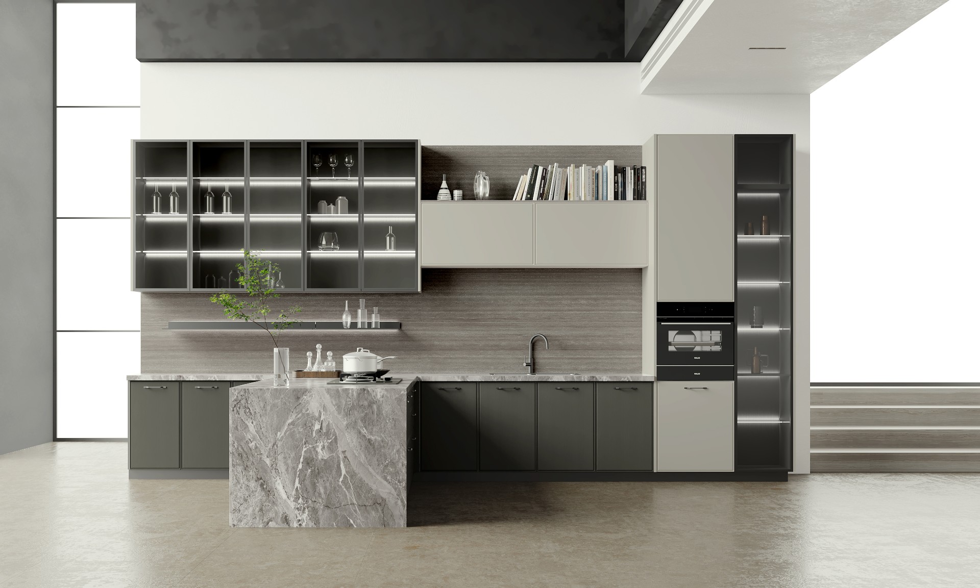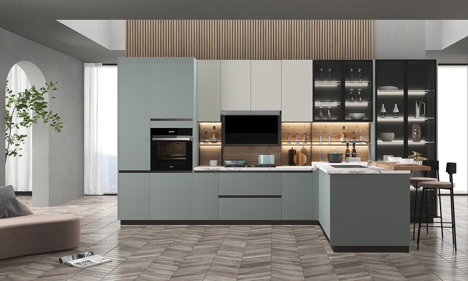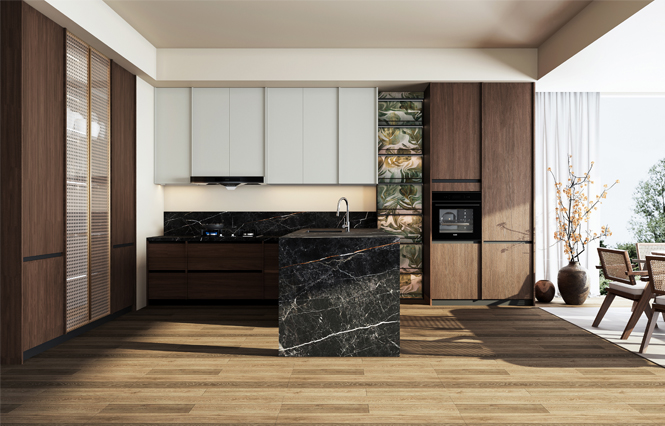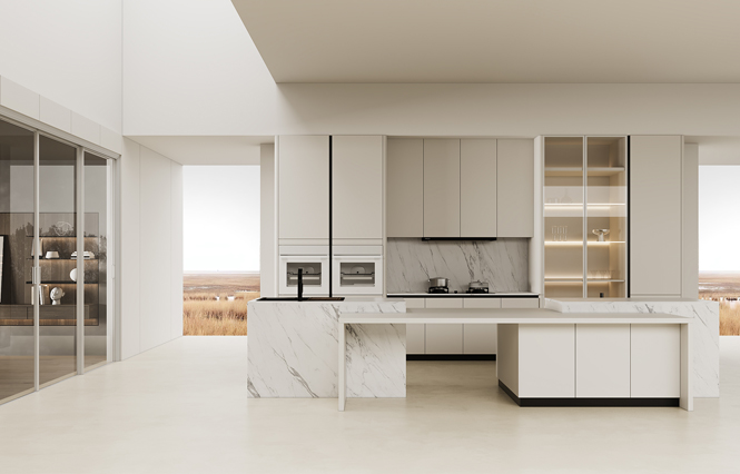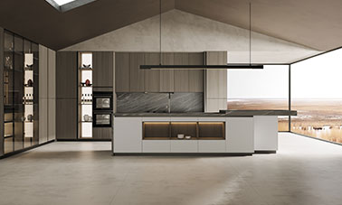 通過米蘭廚柜量體裁柜,定制出適合主廚下廚的烹飪區和洗滌區的舒適高度。